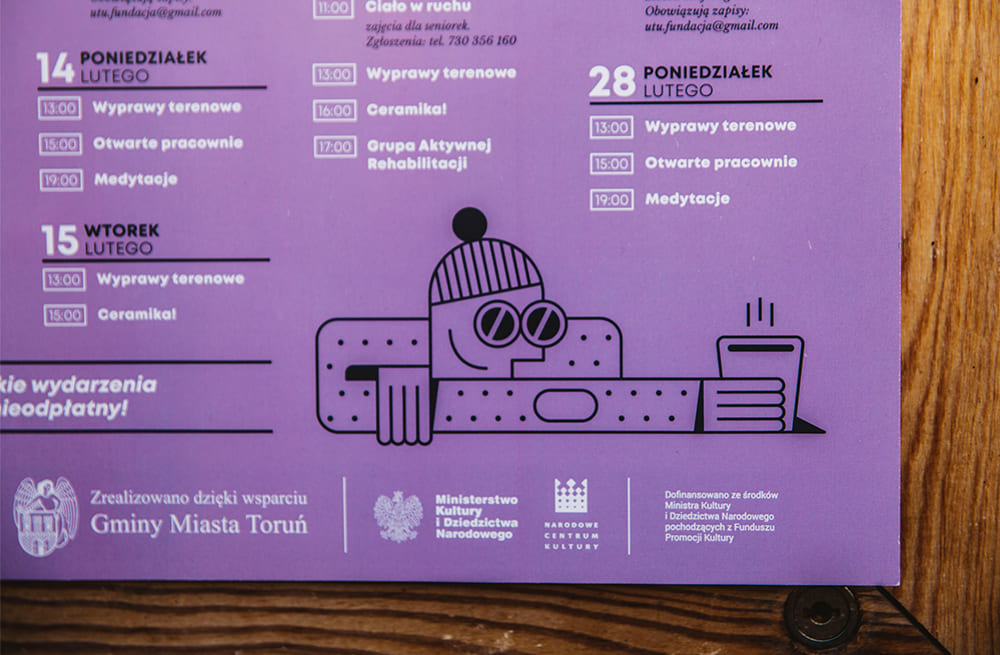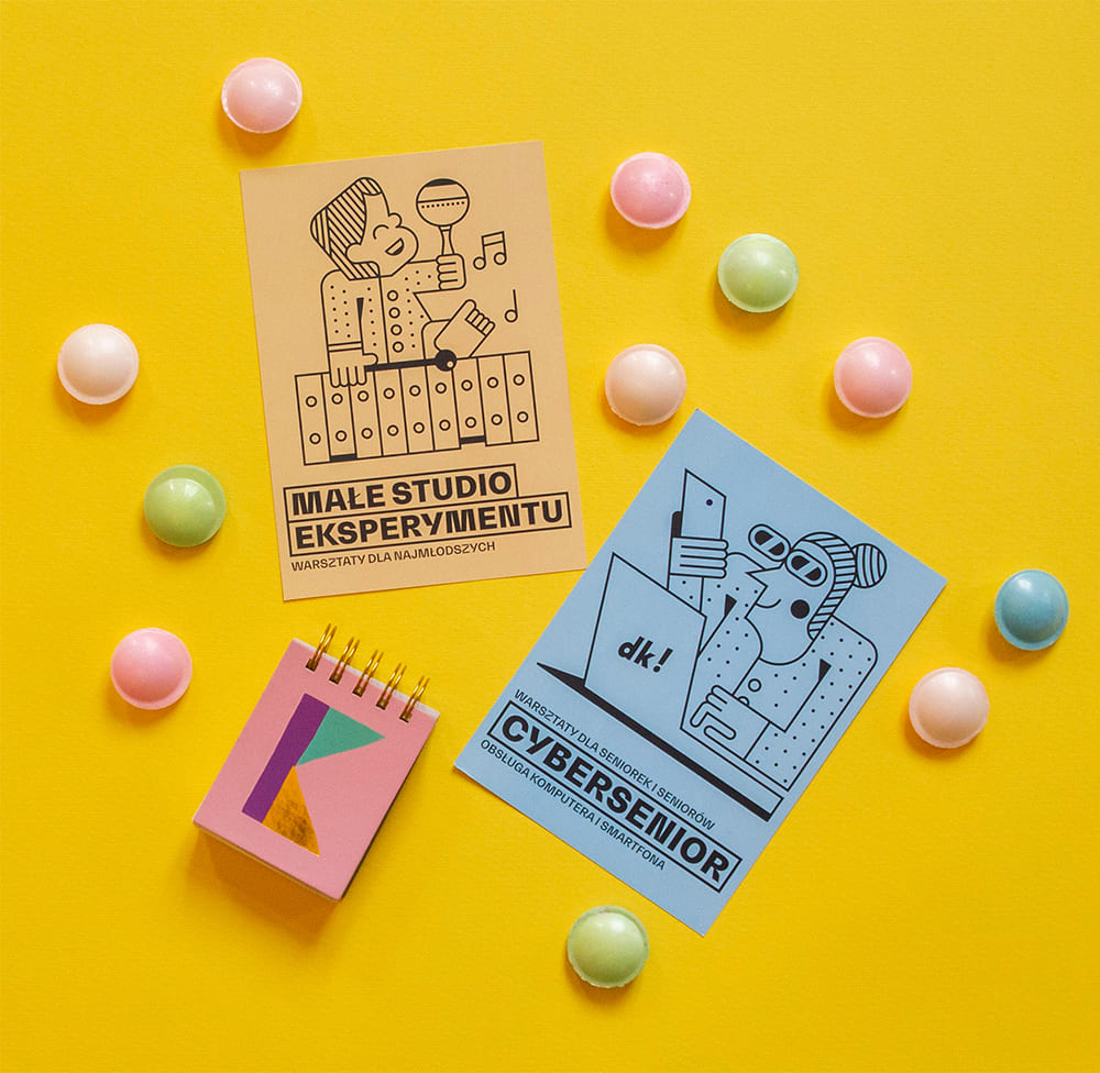 Z domem kultury na Bydgoskim Przedmieściu jesteśmy związani graficznie od samego początku. Prace rozpoczęliśmy w 2014 roku od stworzenia identyfikacji wizualnej nowo powstającej placówki, którą odświeżyliśmy w 2022 roku. Motywem przewodnim znaku jest liternictwo ”dk!”. Obecnie kontynuujemy współpracę, realizując plakaty z programem, ulotki oraz plakaty eventowe. Przygotowywane projekty są oparte o motywy ilustracyjne nawiązujące do edukacji i zabawy. W ramach działań ”domkultury” obsługujemy również klub młodzieżowy Stefa, zaopatrując go w grafikę oraz content przygotowany pod social media (Instagram, Facebook).