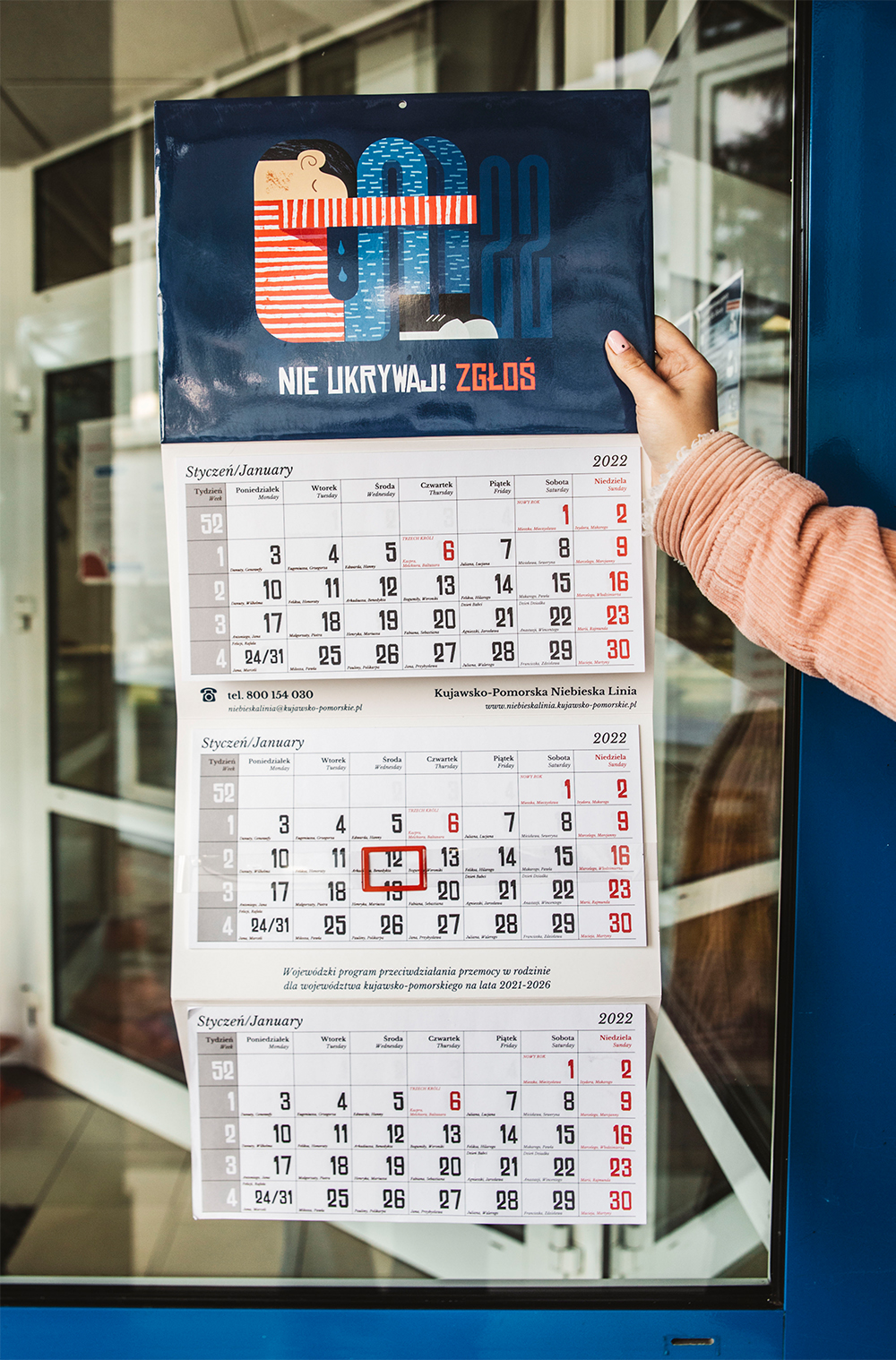 Urząd Marszałkowski w Toruniu zlecił nam zaprojektowanie główki i plecków biurowego kalendarza trójdzielnego. Motywem przewodnim była ilustracja odnosząca się bezpośrednio do problematyki związanej z przemocą w rodzinie i reagowaniem na nią.