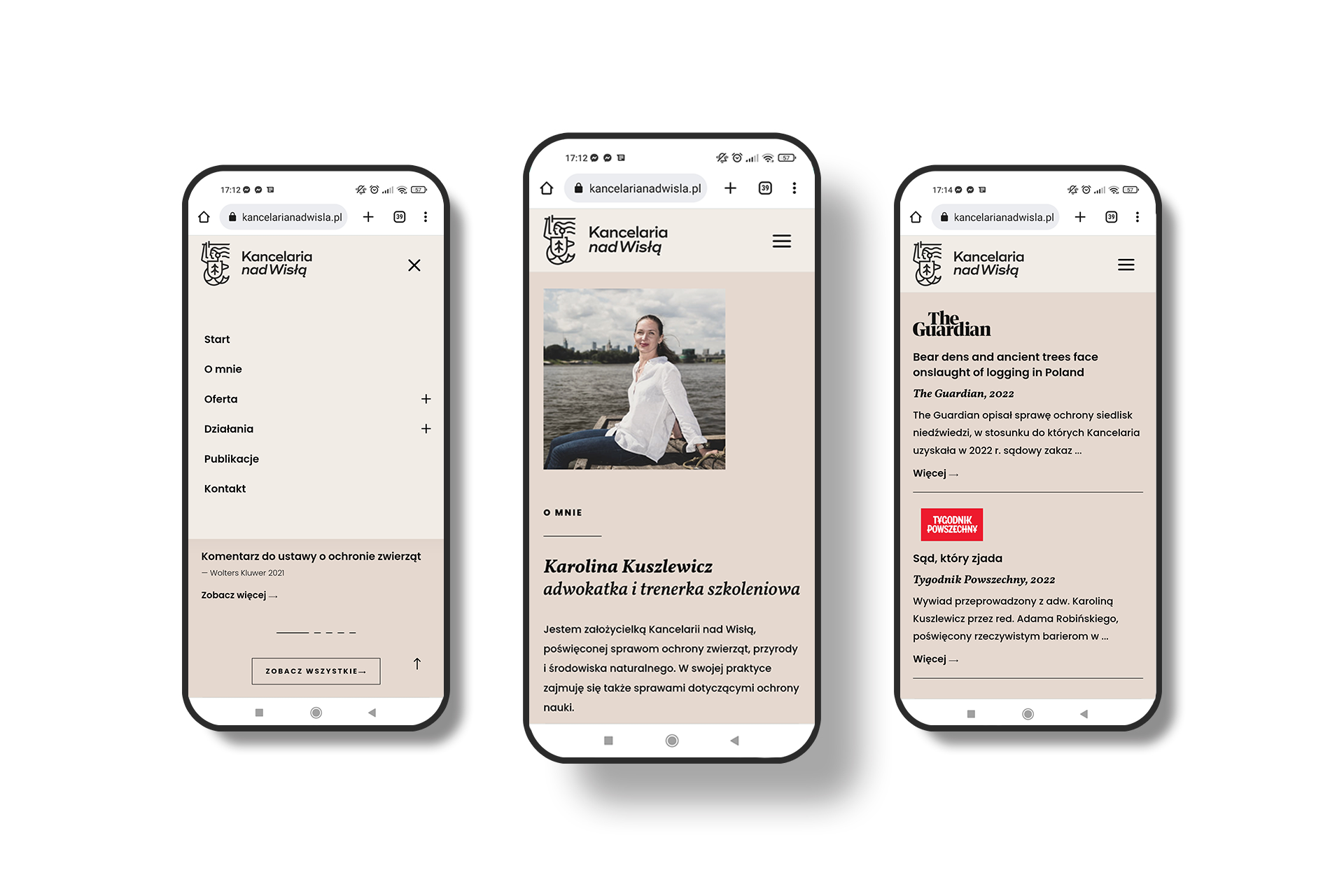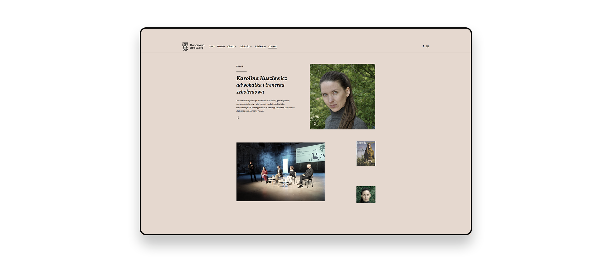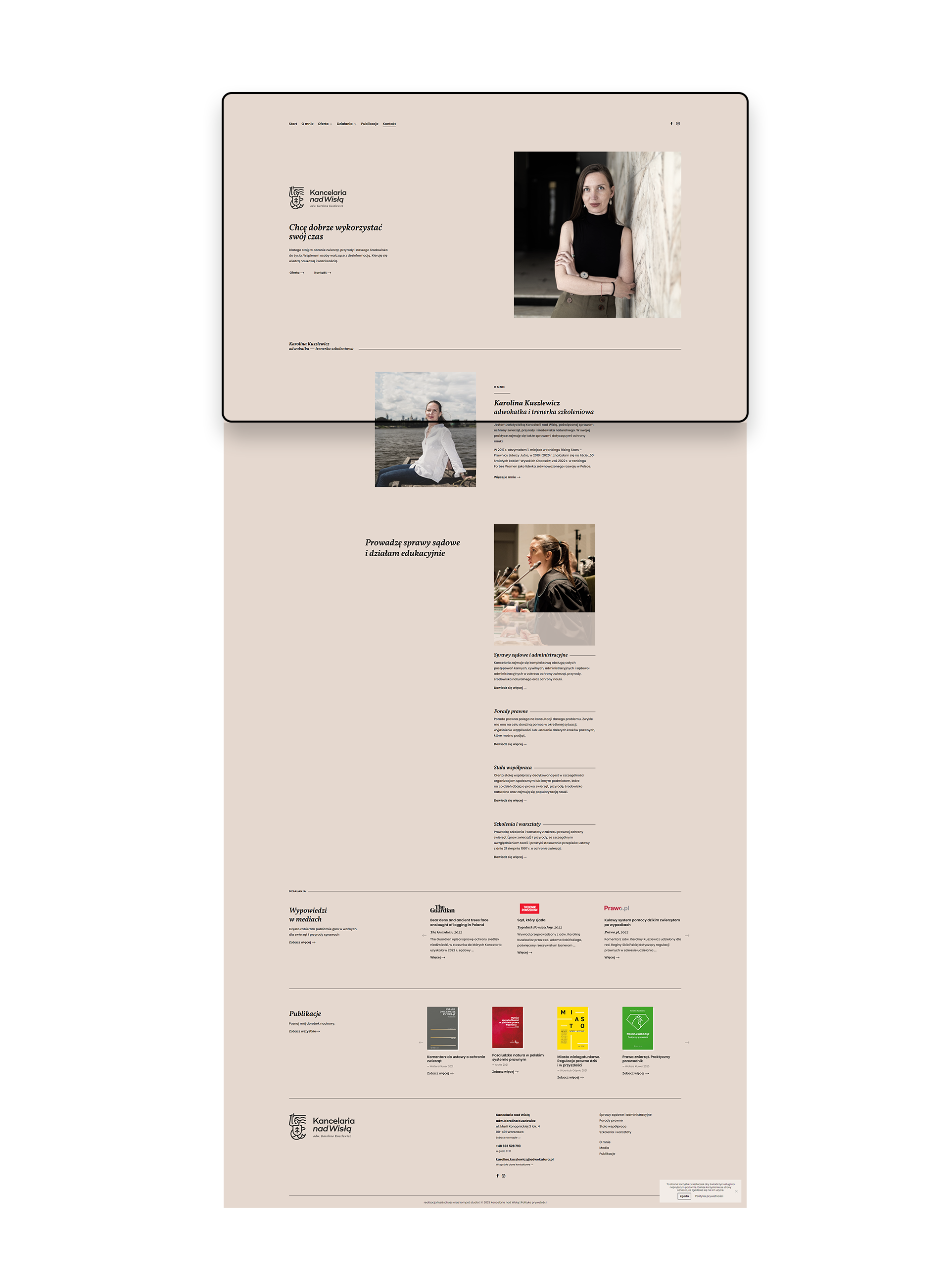 Strona internetowa, którą zaprojektowaliśmy jest w minimalistycznym stylu, dzięki czemu jest wizytówką prezentującą dorobek naukowy oraz ofertę. Prace rozpoczęliśmy od zaprojektowania logo "Kancelarii nad Wisłą" oraz opracowania podstawowego brandingu marki Karoliny Kuszlewicz. Przygotowaliśmy grafiki postów na social media. Zlecenie wykonaliśmy z największą przyjemnością, ponieważ dla nas również liczą się zwierzęta i ich prawa.